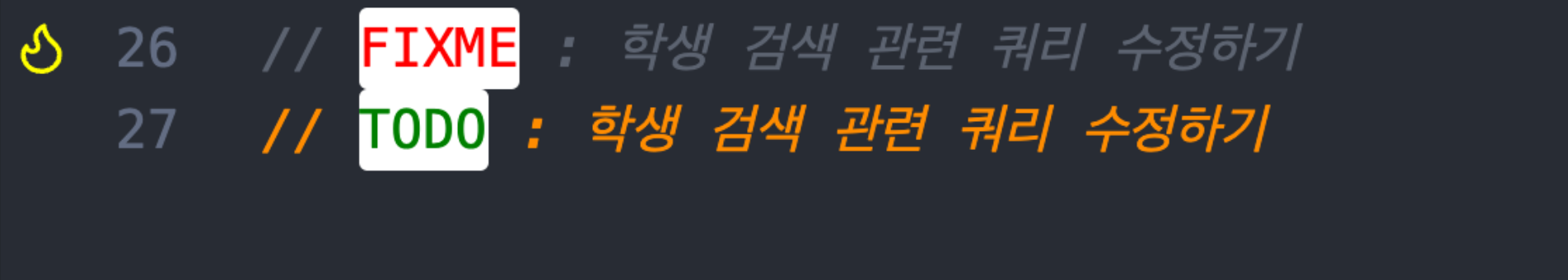 코드에서 또한 다음과 같이 눈에 띄게 표시되기 때문에 우리는 TODO 주석을 더 효율적으로 탐색할 수 있다. 더불어 setting.json에 코드를 추가하면 주석 글자 색이나 아이콘 커스텀이 가능하기 때문에 자세한 내용은 Extension Overview를 참고한다.