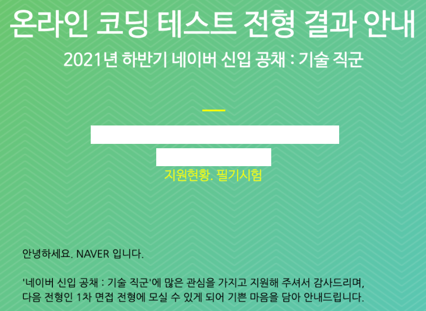 네이버의 경우 코테 채점 결과를 공개하지 않을 뿐 아니라, 상반기 코딩 테스트에서 2.5솔로 불합격한 경험이 있던 터라, 코테 결과에 더욱 자신이 없었다.