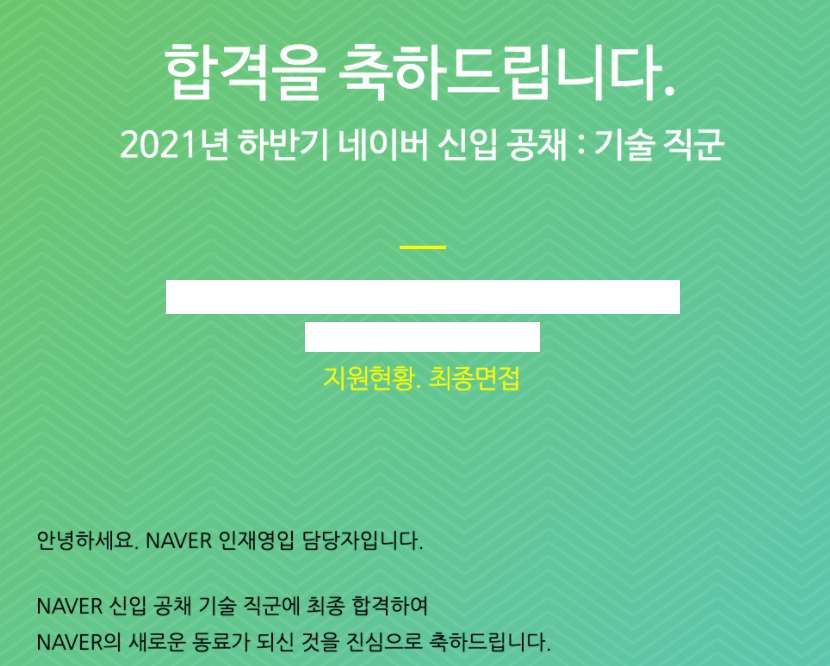 네이버 입사를 꿈꾸는 많은 예비 개발자 분들께서도 많은 도움이 되었길 바라며, 이 최종 합격 결과를 받은 당시를 항상 떠올리며 배움을 게을리 하지 않는 개발자가 되고자 한다.